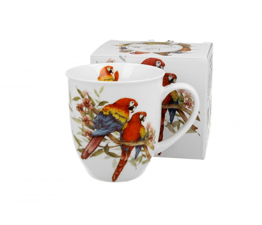 Kubek z motywem wprost ze Świata Ptaków przedstawiający Papugi Ary Szkarłatne wykonany jest z tradycyjnej porcelany kostnej New Bone China.