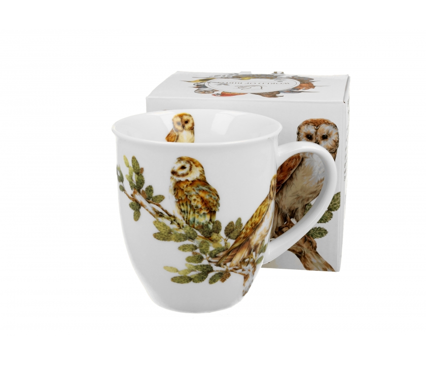 Kubek z motywem wprost ze Świata Ptaków przedstawiający Sowy Zwyczajne wykonany jest z tradycyjnej porcelany kostnej New Bone China.