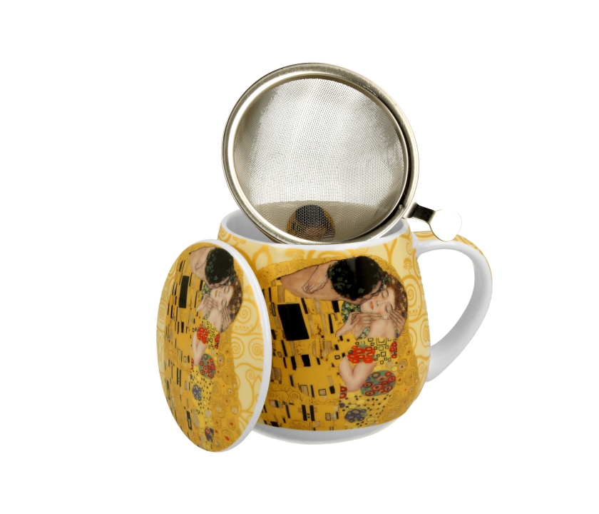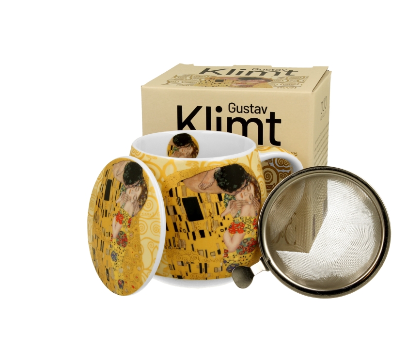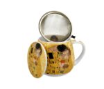 Kubek baryłka z zaparzaczem ozdobiony malarskim motywem z obrazów artysty znanego na całym świecie. Wzór Pocałunku Gustava Klimta podbija również świat porcelany i wkomponowuje się w najnowsze trendy.