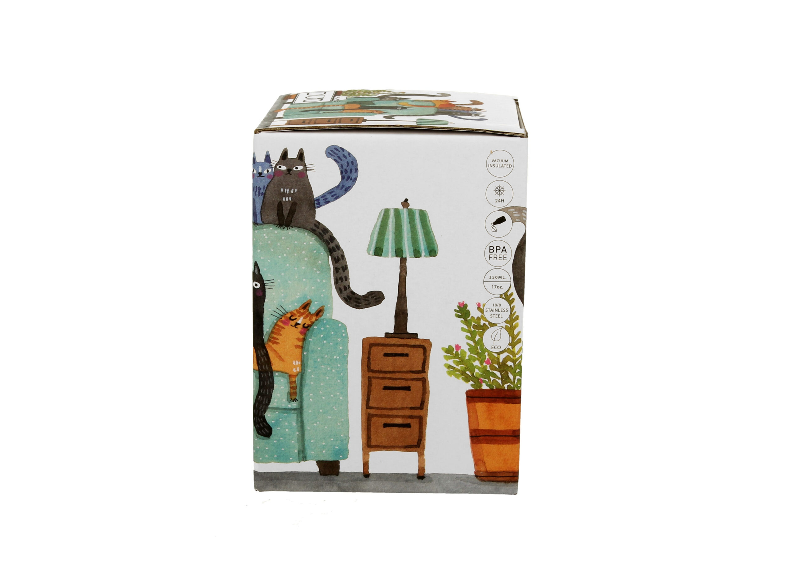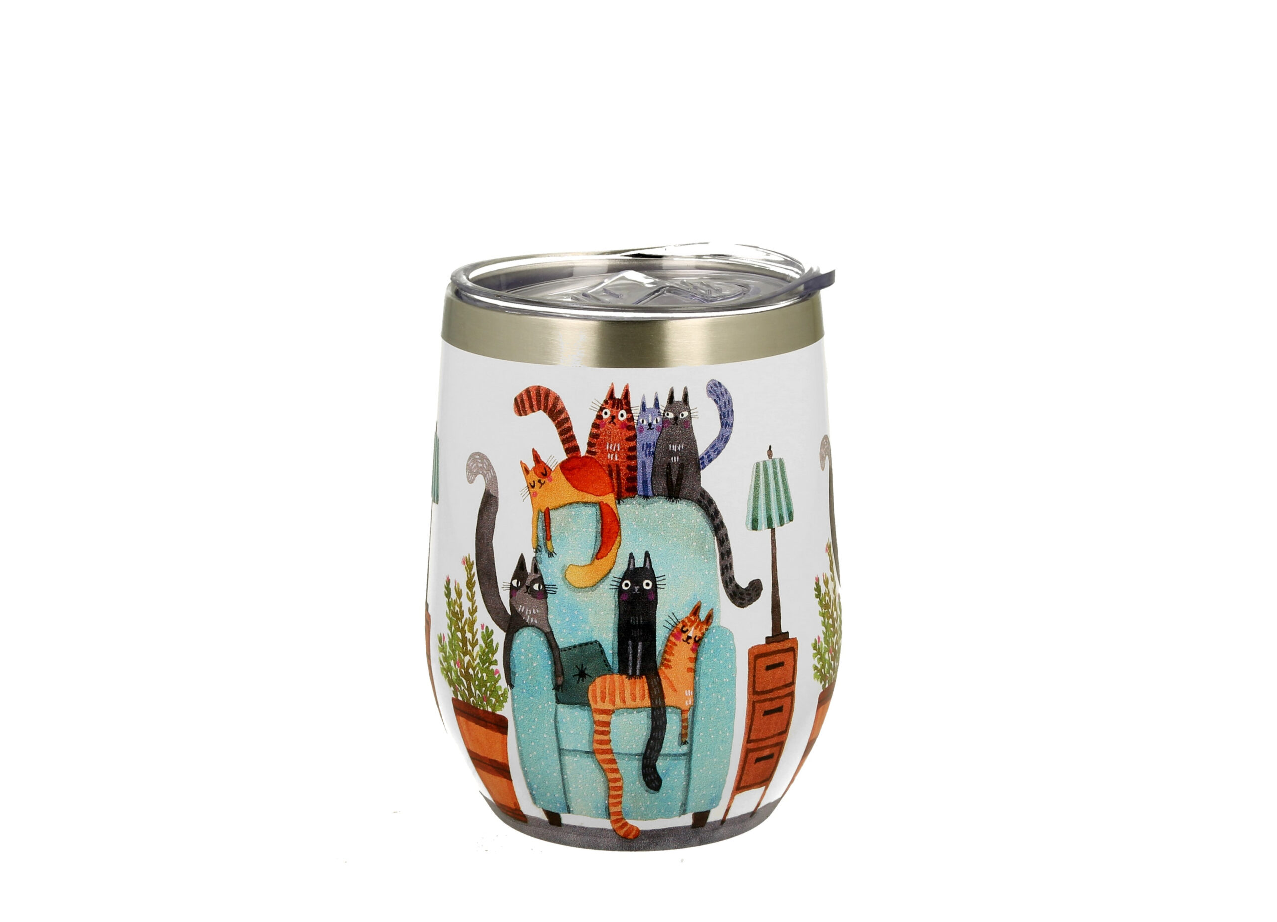Kubek termiczny z pokrywką jest nie tylko praktyczny, ale i pełen piękna. Kolekcja koci świat z motywem kotów na fotelu dodatkowo umili każdy łyk herbaty i wprowadzi odrobinę piękna i ubarwi codzienne życie.