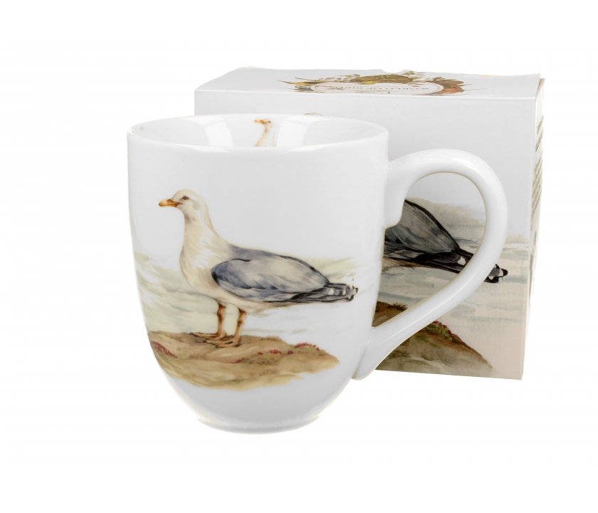 Kubek o największej dostępnej pojemności 1 litra z motywem wprost ze Świata Ptaków przedstawiający Mewę wykonany jest z tradycyjnej porcelany kostnej New Bone China.