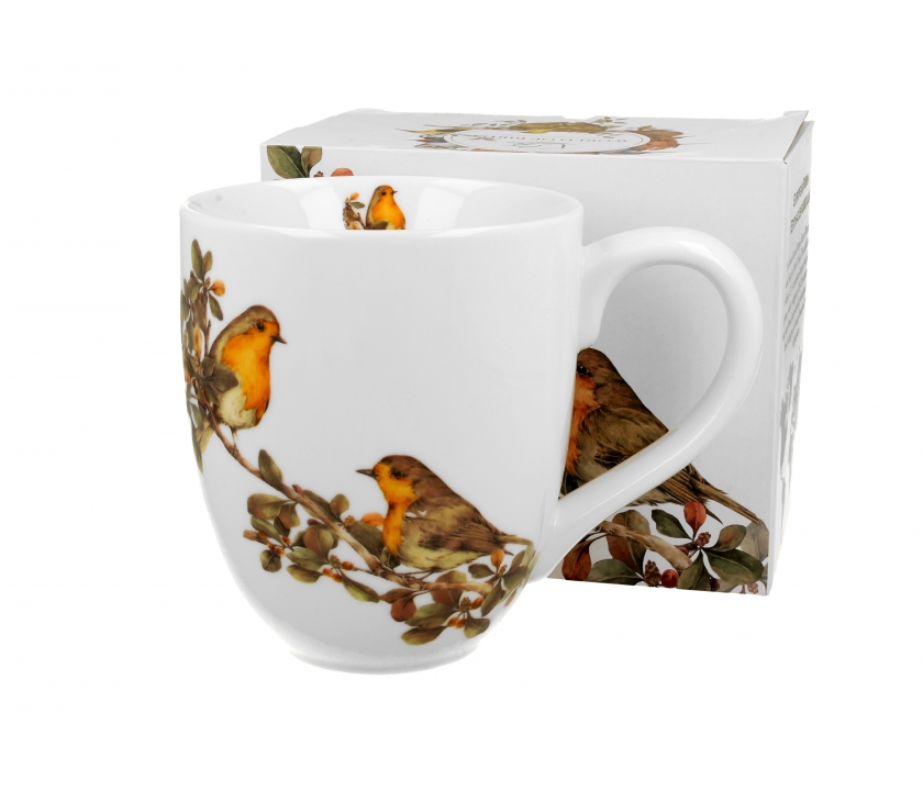 Kubek o największej dostępnej pojemności 1 litra z motywem wprost ze Świata Ptaków przedstawiający Rudziki wykonany jest z tradycyjnej porcelany kostnej New Bone China.
