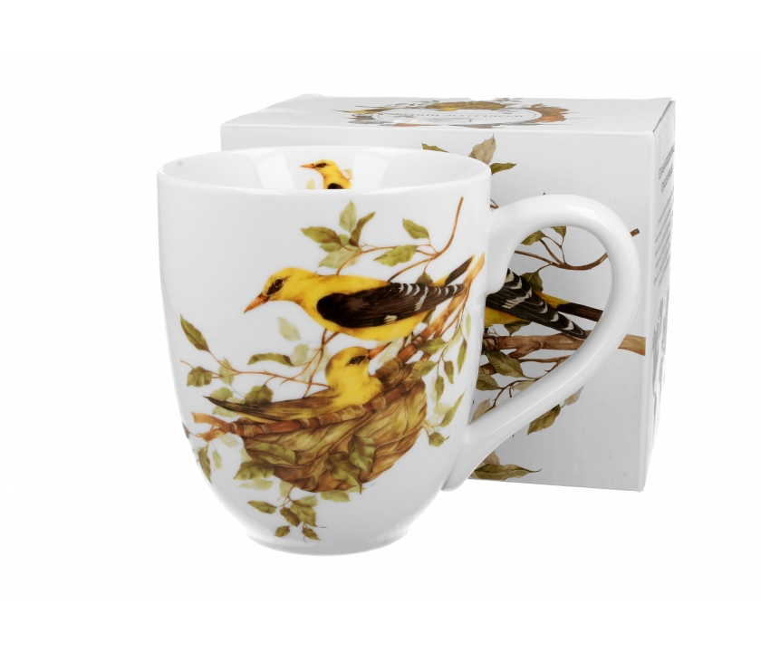 Kubek o największej dostępnej pojemności 1 litra z motywem wprost ze Świata Ptaków przedstawiający Wilgi Zwyczajne wykonany jest z tradycyjnej porcelany kostnej New Bone China.
