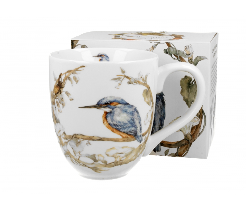 Kubek o największej dostępnej pojemności 1 litra z motywem wprost ze Świata Ptaków przedstawiający Zimorodki Zwyczajne wykonany jest z tradycyjnej porcelany kostnej New Bone China.