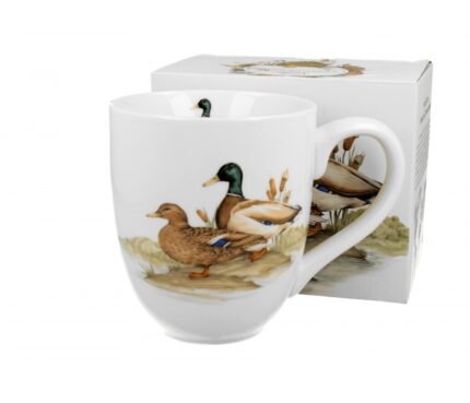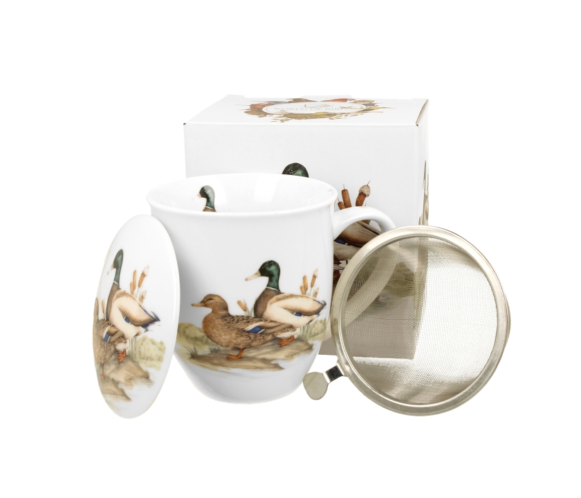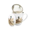 Kubek z zaparzaczem z motywem wprost ze Świata Ptaków przedstawiający Kaczki wykonany jest z tradycyjnej porcelany kostnej New Bone China.