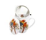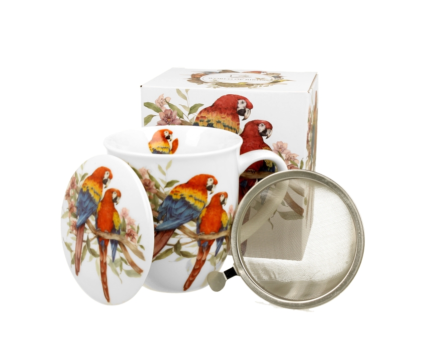 Kubek z zaparzaczem z motywem wprost ze Świata Ptaków przedstawiający Papugi Ary Szkarłatne wykonany jest z tradycyjnej porcelany kostnej New Bone China.