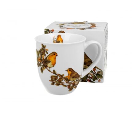Kubek z zaparzaczem z motywem wprost ze Świata Ptaków przedstawiający Rudziki wykonany jest z tradycyjnej porcelany kostnej New Bone China.