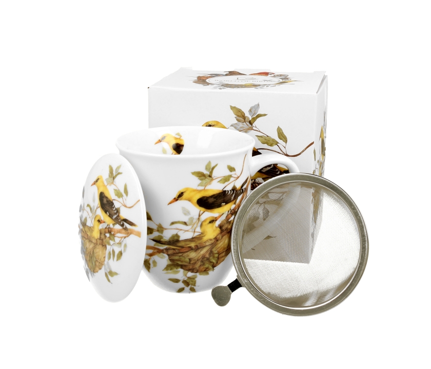 Kubek z zaparzaczem z motywem wprost ze Świata Ptaków przedstawiający Wilgi Zwyczajne wykonany jest z tradycyjnej porcelany kostnej New Bone China.