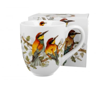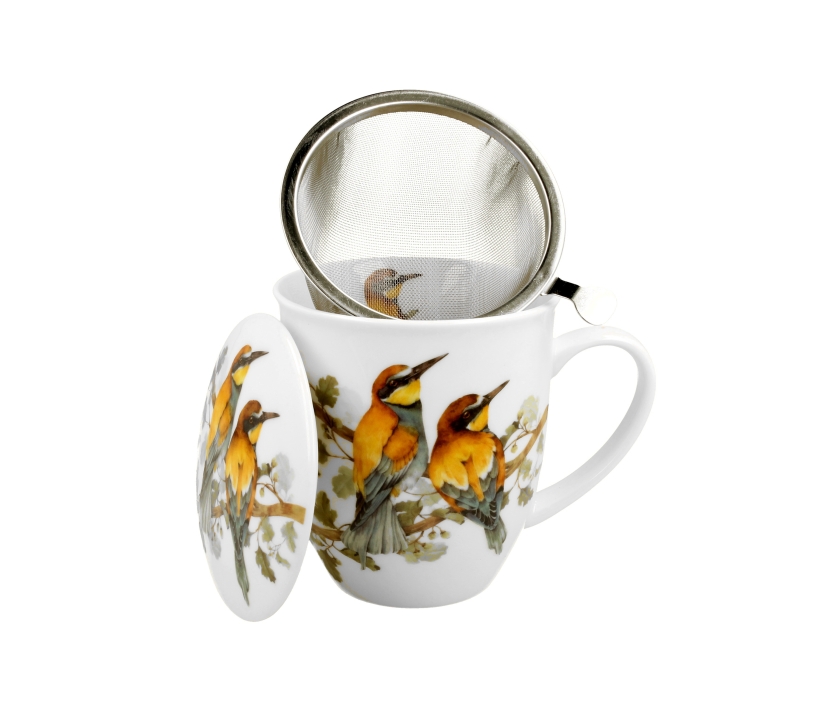 Kubek z zaparzaczem z motywem wprost ze Świata Ptaków przedstawiający Żołny wykonany jest z tradycyjnej porcelany kostnej New Bone China.