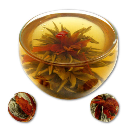 Herbata kwitnąca ręcznie tworzona z najwyższej jakości liści oraz kwiatów zwiniętych w kulkę, która po zalaniu wodą wspaniale rozkwita, ukazując skryte w niej kwiaty. Napar o niezwykłym smaku i aromacie jest symfonią zmysłów zarówno wizualnych jak i estetycznych oraz smakowych.