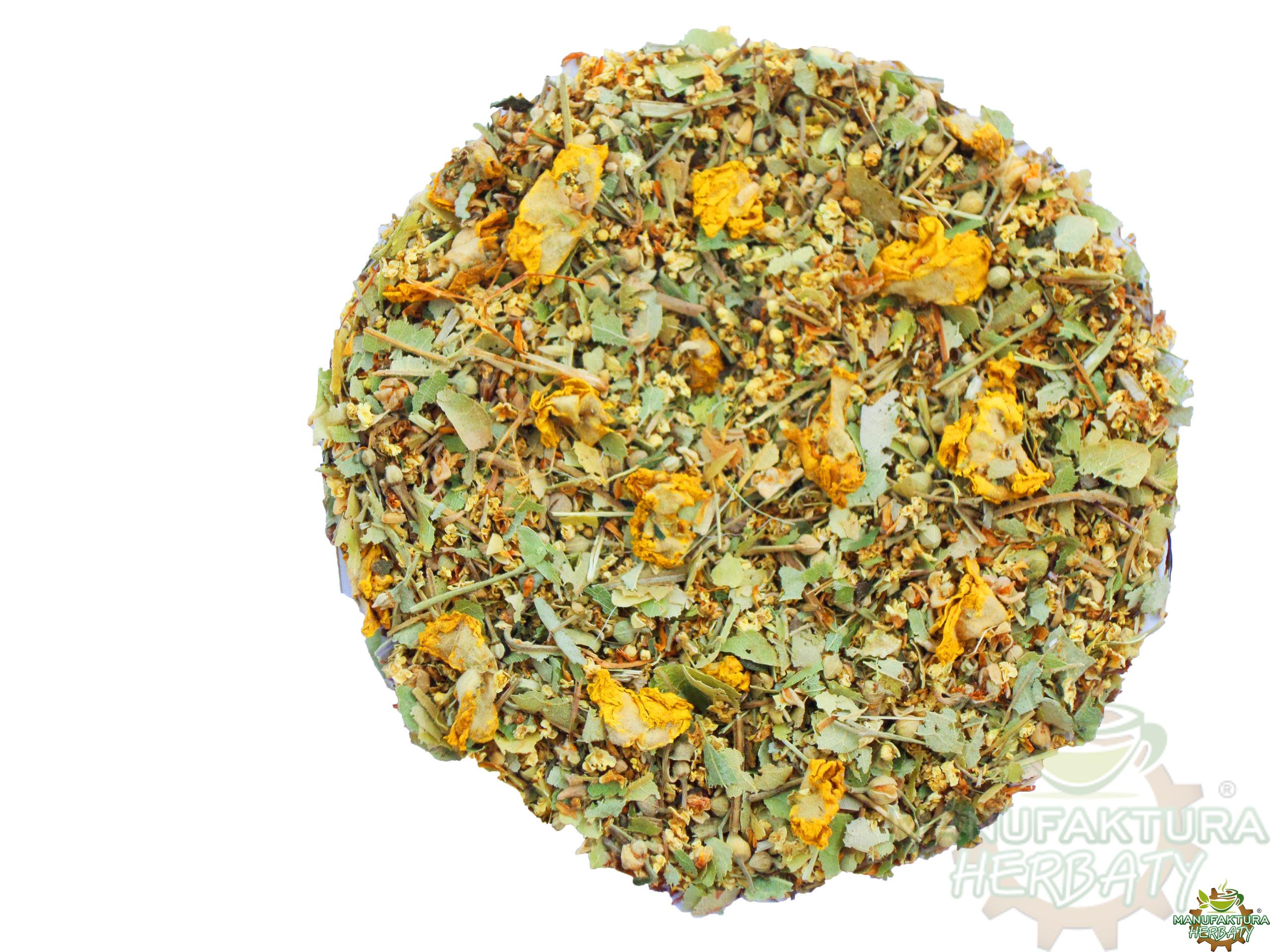 Skład mieszanki ziołowej: kwiat lipy, kwiat czarnego bzu, kwiat dziewanny, kwiat jeżówki purpurowej (echinacei), wiązówka błotna, tymianek.